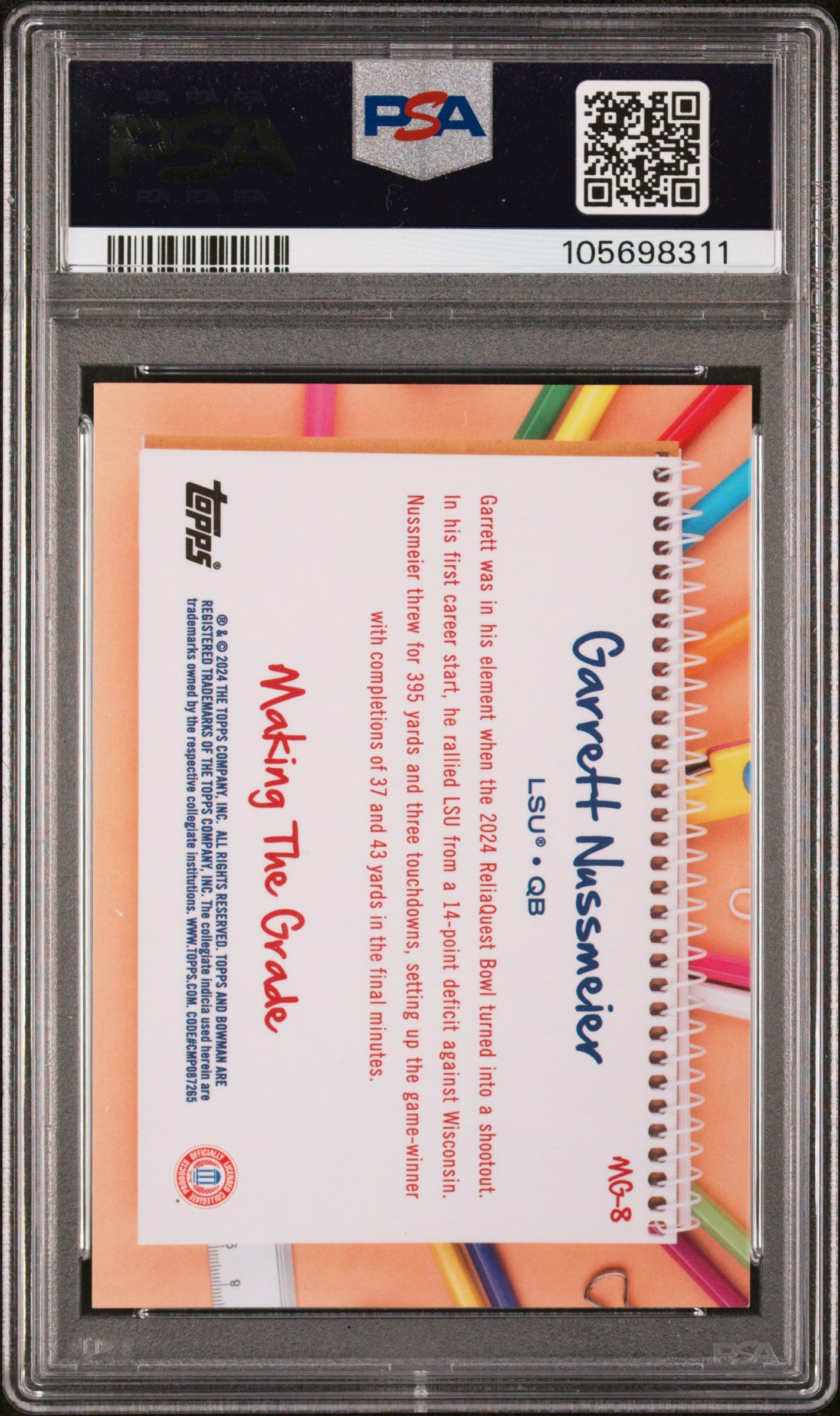 You are purchasing a 2024 Bowman Best University Making The Grade Garrett Nussmeier Teal Ref 14/15 PSA 9. You will receive the exact item in the photographs. Thank you for looking. Listed With Mascot.